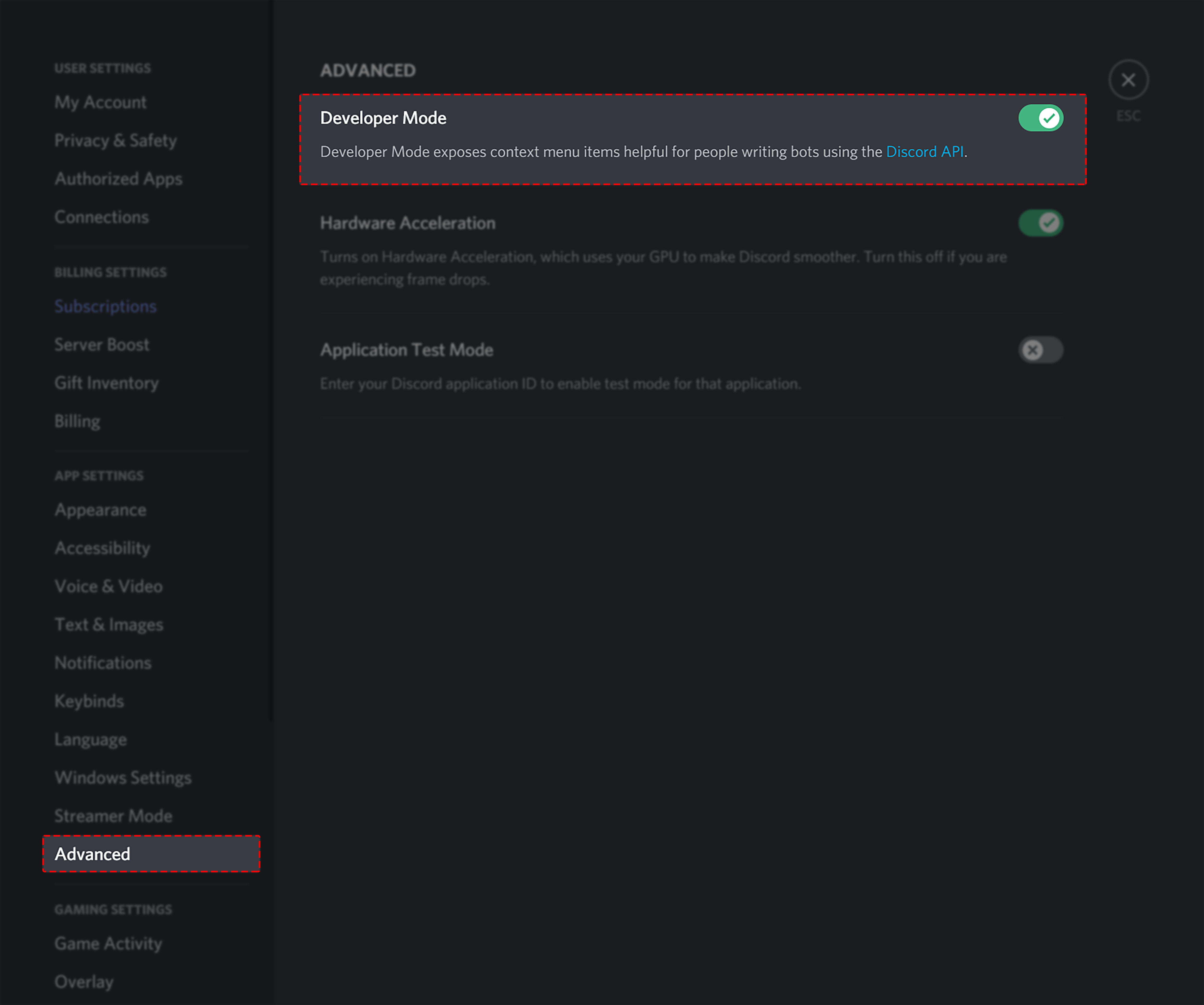You'll find Developer Mode in `User Settings` > `Advanced`